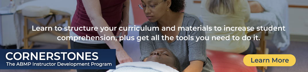 Pro Tip: Cornerstones: The ABMP Instructor Development Program is available to anyone in the profession, and free to all ABMP members and instructors at ABMP Premier schools. This comprehensive training course offers best instructional practices, with content relevant to both new and tenured teachers. Learn more at abmp.com/cornerstones.