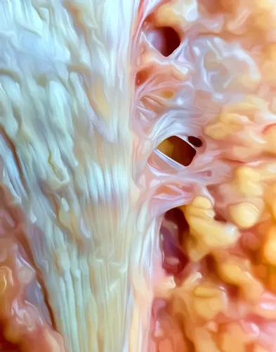 The fat pads are made of micro-sized fat lobules that look like tightly packed, tiny, yellow beads. Measuring just 1-2 millimeters in diameter, each micro lobule is nearly incompressible, hardly deforming at all when under load due to its encasement in a dense, three-dimensional collagen network of specialized septa (skin ligaments). The septa are continuous with the dermis and strongly adhered to the plantar fascia, forming a tight tethering between the two that prevents gliding and helps the foot grip the ground. Without the supportive architecture of the fat pad and its stabilizing relationship to the skin and plantar fascia, walking would feel like slipping on banana peels with a constant risk of losing balance and falling.