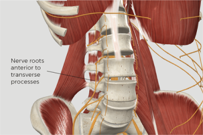 The main concern for massage treatment is whether the therapy can aggravate an existing disc condition or further press on the affected nerve roots. Although the protruding disc and affected nerve root are both anterior to the transverse processes of the spine (Image 2), minor amounts of movement of the individual vertebrae can occur as one applies pressure to the lumbar spine. If a disc protrusion is severe, that spinal movement could be enough to slightly move the nerve and disc against each other and aggravate symptoms. Therefore, avoid using a lot of pressure and keep in close communication with your client about symptom changes.
