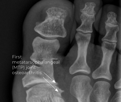 Hallux limitus and hallux rigidus are related degenerative joint conditions that affect the MTP joint of the big toe (Image 3). Hallux limitus is the earlier stage of osteoarthritis characterized by reduced range of motion in the MTP joint, particularly during extension. Common signs and symptoms include mild pain, especially on top of the toe joint, stiffness, the development of a callus under the big toe, and difficulty flexing or extending the toes.