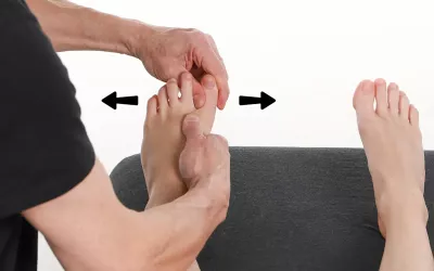 Continue bracing the first metatarsal and glide the base of the proximal phalanx to the left without bending the toe and then to the right. Repeat this back-and-forth gliding motion several times within the client's pain tolerance.