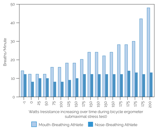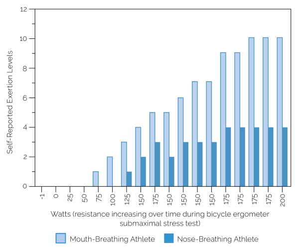 One definition of being in "the zone" is experiencing your best race as your easiest race. To measure this in our study, we used the Borg scale of perceived exertion. Twenty high school athletes rode a stationary bicycle at 200 watts of resistance while mouth breathing (control/conventional group) or nose breathing on consecutive days. During mouth breathing, the average perceived exertion was a 10 out of 10 (10 being the most intense experience of exertion). In stark contrast, athletes using nose breathing perceived the same workout at just a 4 out of 10 on the exertion scale.