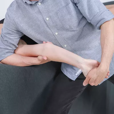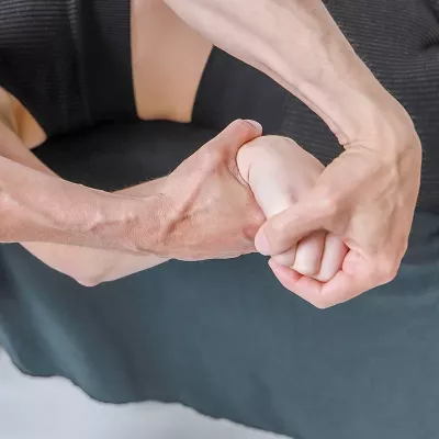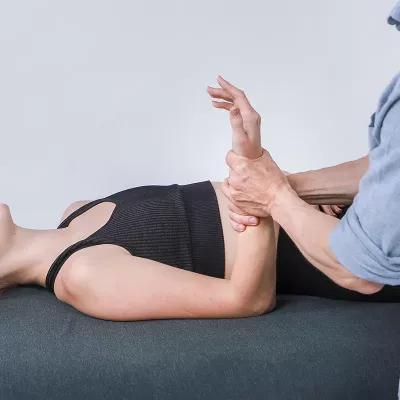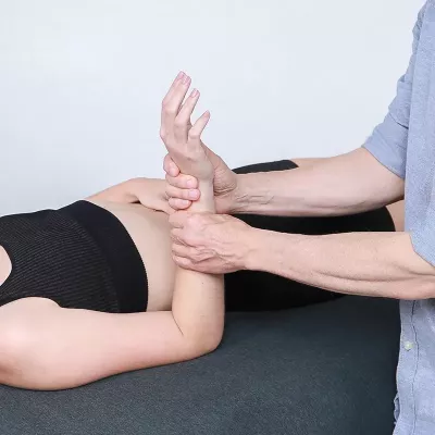 Using your left hand, grasp the client's right arm above the elbow with the client's arm abducted to 90 degrees. Rest your forearm on the table to brace the superior border of the client's shoulder to stabilize it. With your right hand, grasp the client's wrist and externally rotate the client's arm. Your fingers contact and extend the client's thumb, index, and middle fingers while supinating their wrist.