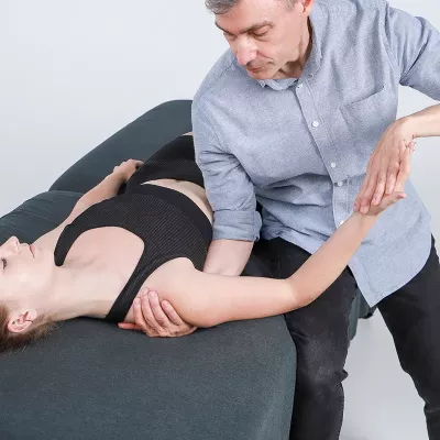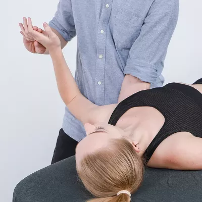 Move the client so their right shoulder is slightly off the edge of the therapy table. Use your left leg to depress and brace the client's shoulder. If the client reports pain when you depress and brace their shoulder, they likely have an issue proximally. Address any proximal restrictions before you move forward with nerve mobilization.
