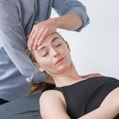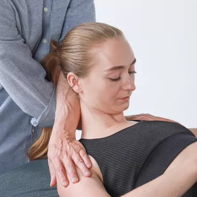 Place the flat palm of one hand under the back of your dominant hand and lift the client's head and neck so that your wrists rest on the therapy table. Bring your thumbs ½-inch apart and place them into the lamina groove on either side of the spinous processes. Mobilize the client's neck by pushing up with both thumbs into the groove. The rhythmic action juts the client's chin as each vertebral segment (C2-3 to C7-T1) extends over the thumb fulcrum. Jut the client's chin for two minutes.