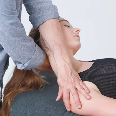 The brachial plexus passes through the anterior and medial scalene muscles. In contrast, the upper portion of the long thoracic nerve passes between the middle and posterior scalene. In this technique, we stretch the scalene muscles and mobilize these nerves. Your right hand slowly rotates, and the left sidebends the client's neck to the first restrictive barrier using a counterforce between the left hand and the right forearm. Repeat this technique on the right side and then repeat the sequence 3-5 times, assessing the quality of the movement for improvement.