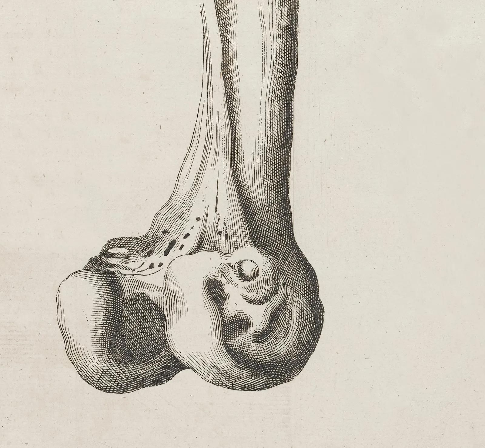 The femur is beautiful and, like anything profound, “contains multitudes.” It is an entire human in miniature. Head, neck, two prominences or trochanters as arms; its long, sinuous shaft winding its way through the forest of the body; two condyles as feet (Image 1).