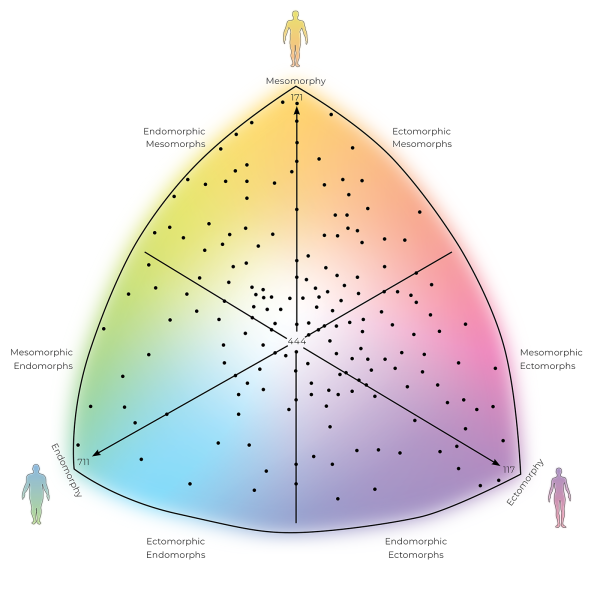 Additionally, Sheldon identified intermediate types. As well as the more “pure” types, he identified some as meso-endo, ecto-meso, or ecto-endo, indicating that their composition had elements of both types strongly expressed. If all was balanced (444 in Sheldon’s system), that put you right in the middle of the triangle for a seventh type.