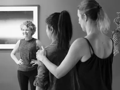 Let’s take a look at this work in action. Sydney, age 53 and an avid yoga practitioner, arrives to see me for some recent but persistent low-back stiffness and pain. After we talk, I ask her to take a walk around the room. Before she takes her first step, I notice a slight sinking of her weight. It’s subtle, but enough to tighten the back of her pelvic floor and take her a little back on her heels. As she steps forward, I am watching, sensing, noticing what resonates in my body, what emerges in my felt sense. I feel myself sensing the ground and subtly going backward to go forward.