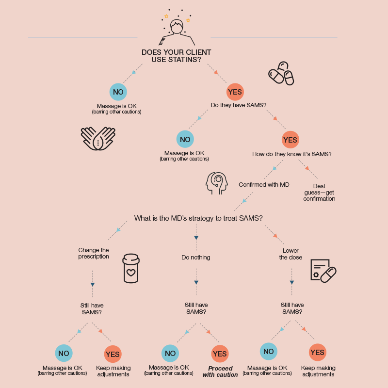 For all these reasons, my advice is to proceed with caution. The best choice is to encourage the client to consult with their prescribing physician so they can make adjustments, or change their dosage or prescription to a different statin that doesn't cause SAMS. Then, we can design a massage therapy strategy that is customized to fit that client's ability to adapt to the homeostatic challenges our work may bring about.
