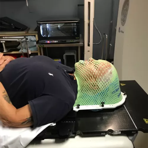 When the time came to start treatment, a medical physicist (who knew such a specialty job existed?) determined the appropriate radiation dose, which had to be delivered with pinpoint precision. To achieve that, they made a mask: a flat piece of plastic mesh was heated and then put on Jan's face to conform to her shape as it cooled and shrank, a process that took about 45 minutes.