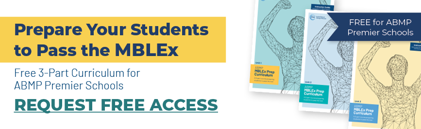Pro Tip: All ABMP Premier School members have access to Cornerstones: The ABMP Instructor Development Program. This 25-hour online teacher training program covers everything from handling difficult classroom behaviors to building lesson plans to getting the most learning out of your student clinic experience. Learn more at abmp.com/cornerstones.