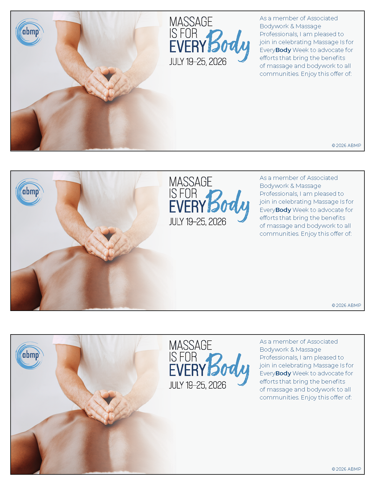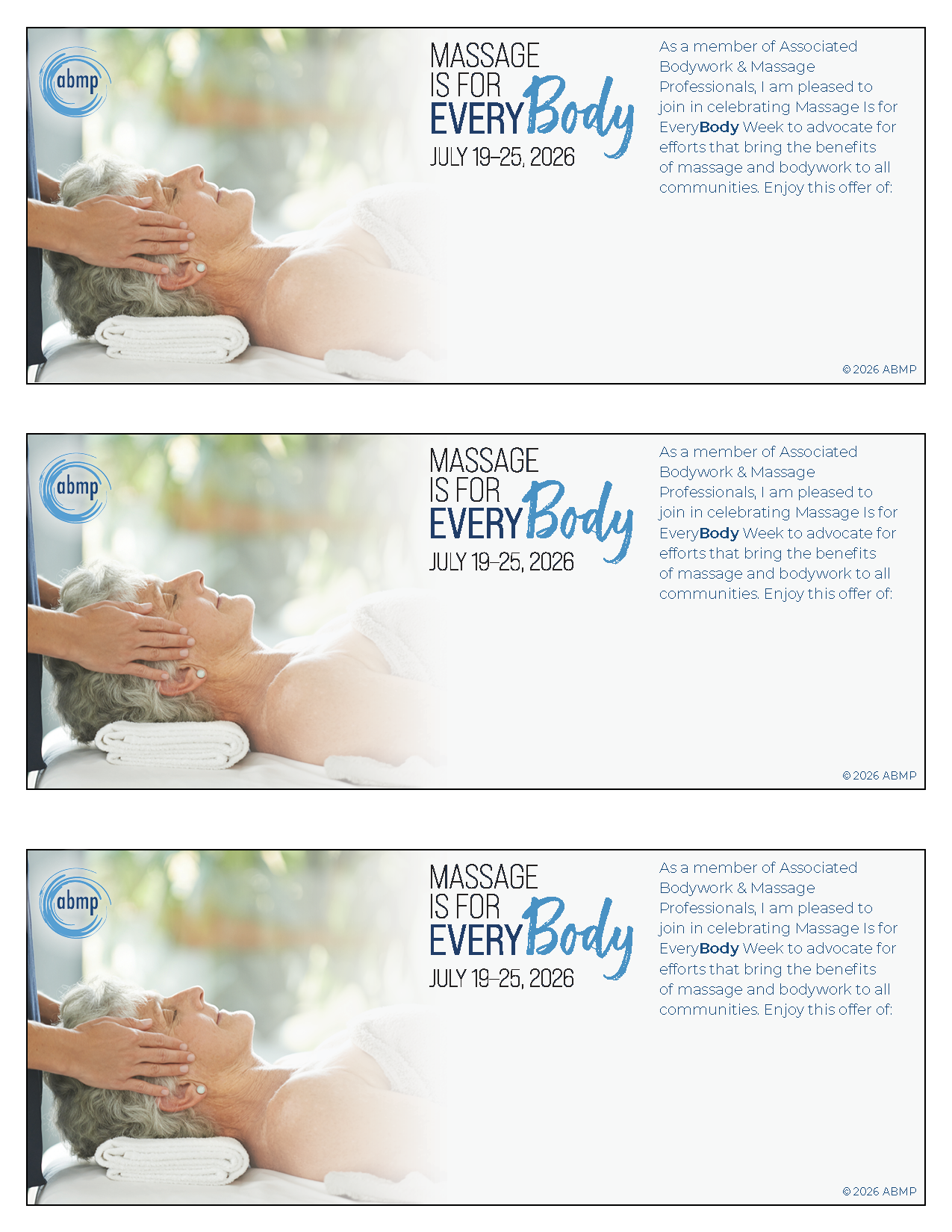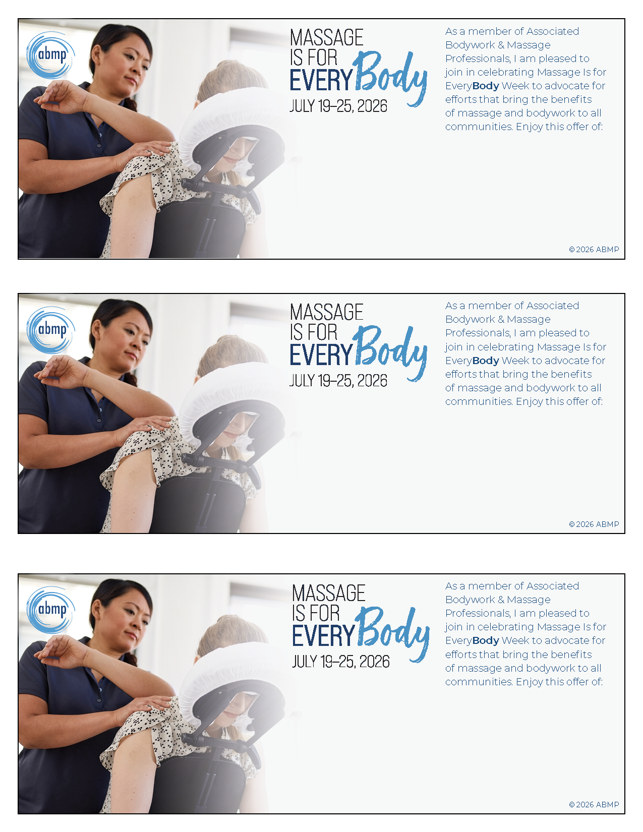 The coupons read: "As a member of Associated bodywork & Massage Professionals, I am pleased to join in celebrating Massage is for EveryBody Week to advocate for efforts that bring the benefits of massage and bodywork to all communities. enjoy this offer of:.."