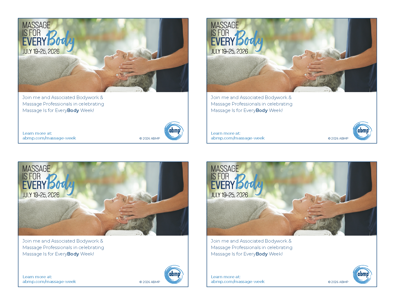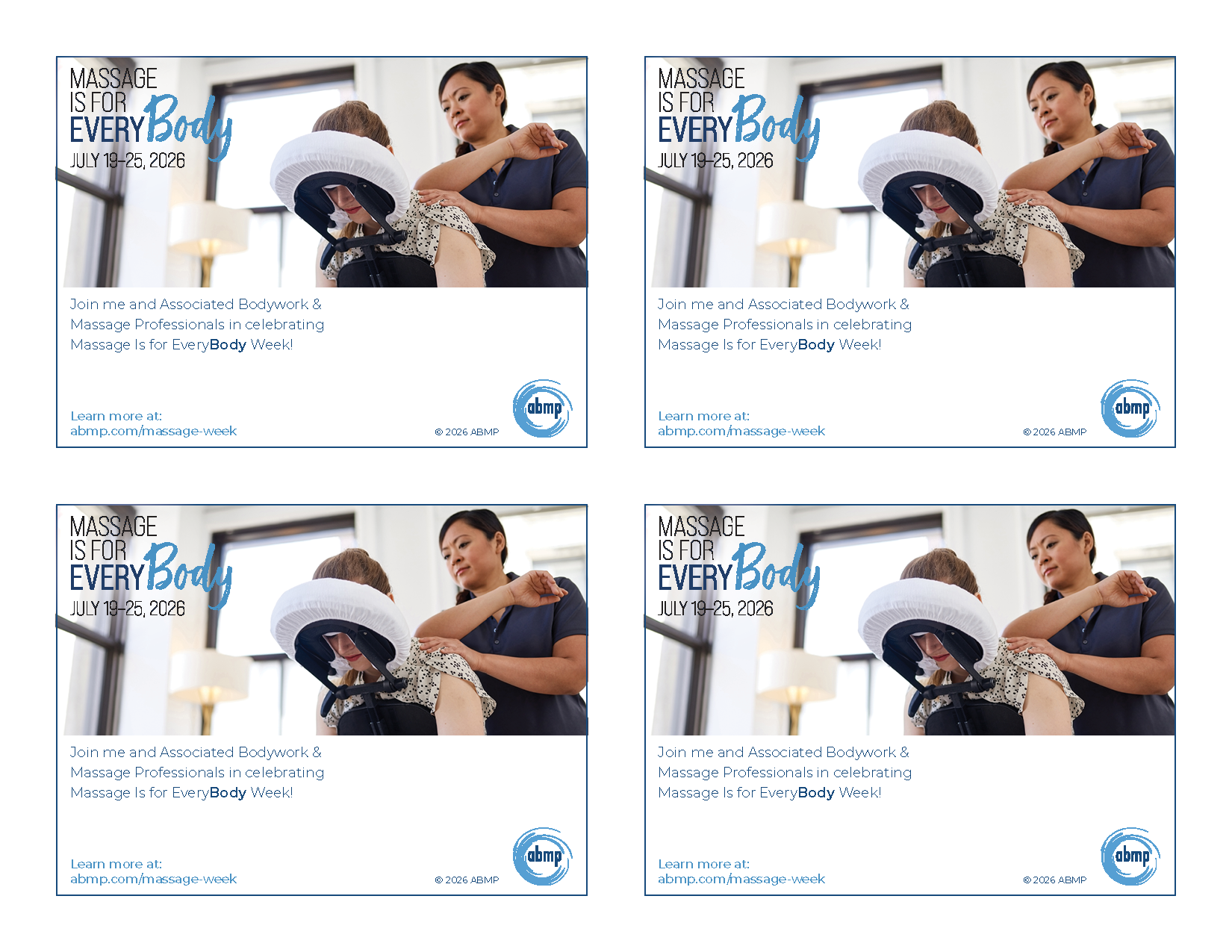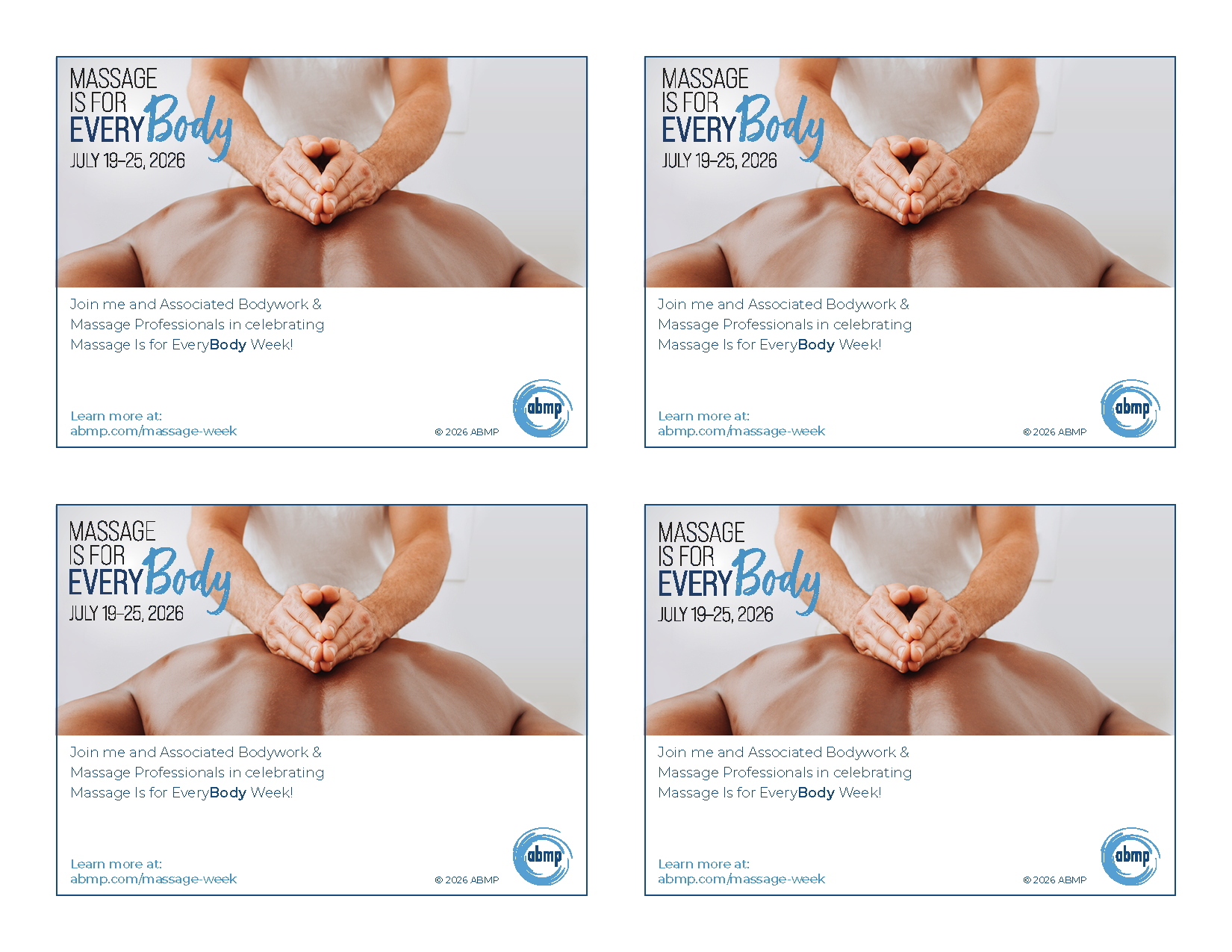The Postcards read: "Join me and Associated Bodywork & Massage Professionals in celebrating Massage Is for EveryBody Week!"