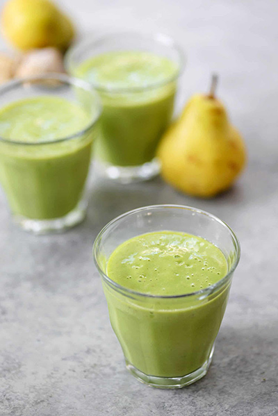 When you’re tired of water, try this simple ginger pear smoothie for delicious, vitamin-infused hydration. Serves 4.