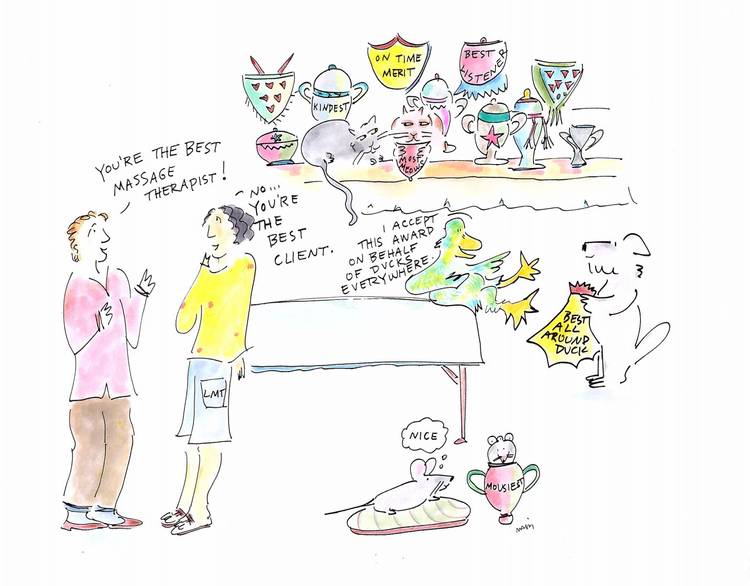 All of you who read and enjoyed Nina and Mari’s Heart of Bodywork column in Massage & Bodywork for so many years will always remember the devious ducks, cheeky chickens, devoted dogs, and crafty cats that danced in and out of her drawings. This year we’re publishing excerpts from the 2016 edition of The Educated Heart updated by Laura Allen, and those excerpts are also complemented by Mari’s drawings. They have a way of adding mirth and insight to the most serious of topics—and they’ll be forever enshrined in the pages of Massage & Bodywork.