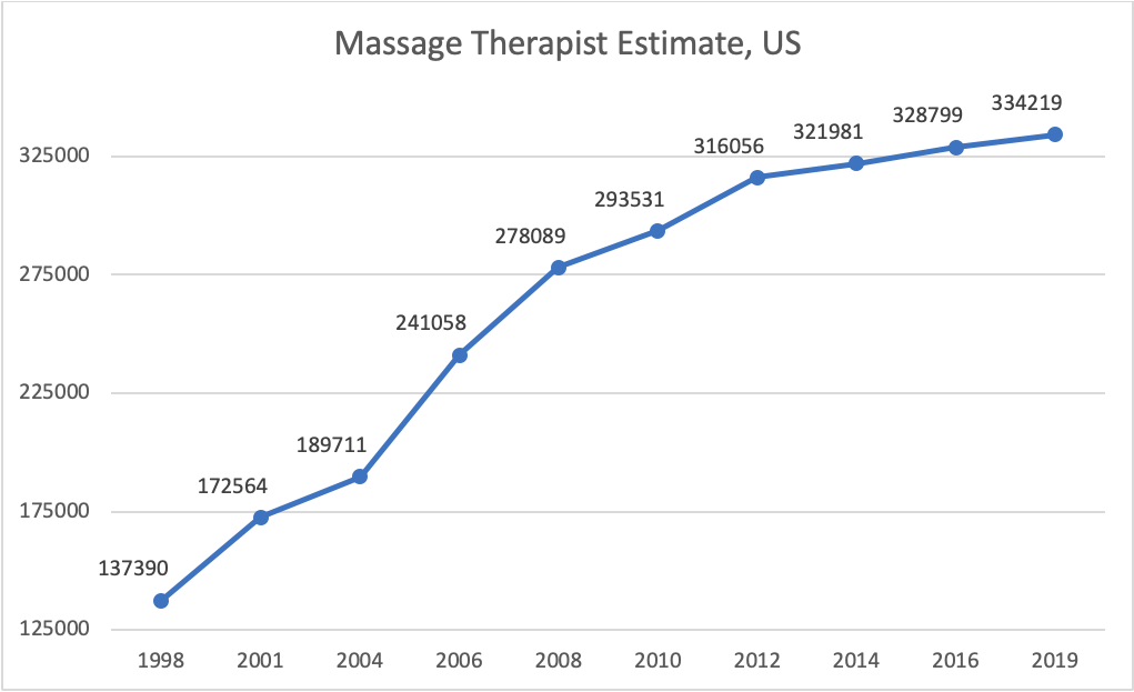 From 1998 to 2012 our estimates show the massage therapist population growing 130 percent (from 137,390 to 316,056), but that steep growth curve has continued to flatten since then. This trend lines up with ABMP research into massage schools and graduates, which have declined from a peak in 2008.
