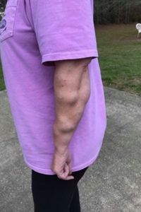 Lipomas are fatty tumors, usually in the superficial fascia. These can occur anywhere, on the trunk, right over the spine, and on the extremities as we see in this photograph.