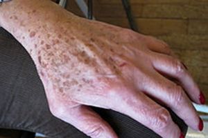 A sunspot (also called a lentigo or actinic lentigo), is a flat, slightly darker area that appears in older people, usually on the face or other areas that are sun-exposed, like the hands. They may be small, like in this photograph, or quite large. They are usually symmetrical: round or oval.