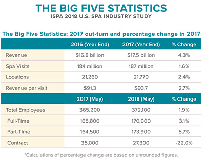 During its September conference in Phoenix, the International SPA Association (ISPA) released its full annual findings of spa industry indicators, reporting a record high in total spa industry revenue at over $17.5 billion in 2017.