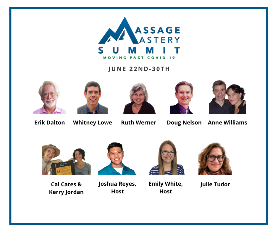 The Massage Mastery Summit is a series of free online virtual presentations taking place from June 22–30. Hosted by Joshua Reyes and Emily Rene, two licensed massage therapists, the goal of the event is to give bodyworkers information and best practices for moving forward through the COVID-19 pandemic while building connection and community.